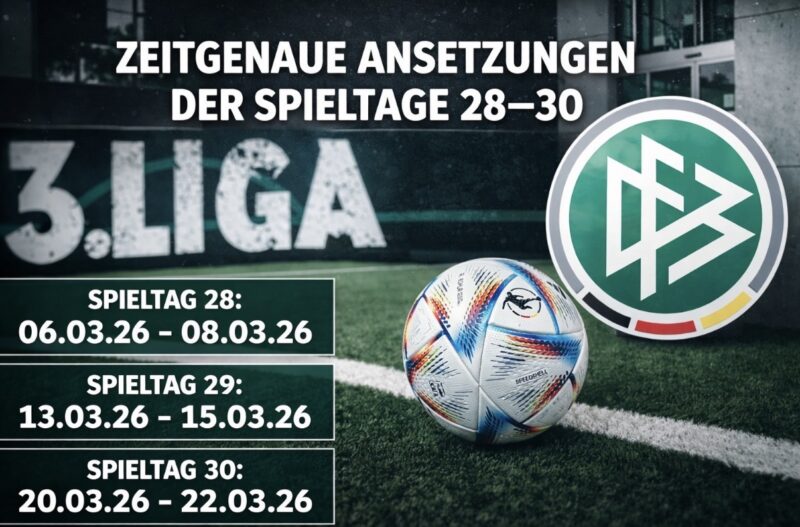 News3. Liga: DFB terminiert die Spieltage 28-30 zeitgenauVon Liga 3 News Redaktion - 10.02.2026 - 16:26TeilenFacebookXPinterestWhatsApp Der DFB hat kürzlich die zeitgenaue Ansetzung für die Spieltage 28-30 veröffentlicht.Spieltag 28: 3. Liga Fr.. 06.03.2026 - 19:00 FC Viktoria Köln 1904 - - TSV 1860 München 3. Liga Sa.. 07.03.2026 - 14:00 FC Erzgebirge Aue - - Alemannia Aachen 3. Liga Sa.. 07.03.2026 - 14:00 FC Energie Cottbus - - F.C. Hansa Rostock 3. Liga Sa.. 07.03.2026 - 14:00 SV Wehen Wiesbaden - - VfB Stuttgart II 3. Liga Sa.. 07.03.2026 - 14:00 TSG Hoffenheim II - - Rot-Weiss Essen 3. Liga Sa.. 07.03.2026 - 14:00 FC Schweinfurt 05 - - SSV Ulm 1846 Fussball 3. Liga Sa.. 07.03.2026 - 16:30 SSV Jahn Regensburg - - VfL Osnabrück 3. Liga So.. 08.03.2026 - 13:30 SV Waldhof Mannheim 07 - - TSV Havelse 3. Liga So.. 08.03.2026 - 16:30 MSV Duisburg - - 1. FC Saarbrücken 3. Liga So.. 08.03.2026 - 19:30 FC Ingolstadt 04 - - SC Verl Spieltag 29: 3. Liga Fr.. 13.03.2026 - 19:00 Alemannia Aachen - - FC Energie Cottbus 3. Liga Sa.. 14.03.2026 - 14:00 1. FC Saarbrücken - - SSV Jahn Regensburg 3. Liga Sa.. 14.03.2026 - 14:00 VfL Osnabrück - - SV Waldhof Mannheim 07 3. Liga Sa.. 14.03.2026 - 14:00 F.C. Hansa Rostock - - MSV Duisburg 3. Liga Sa.. 14.03.2026 - 14:00 TSV Havelse - - FC Viktoria Köln 1904 3. Liga Sa.. 14.03.2026 - 14:00 Rot-Weiss Essen - - FC Erzgebirge Aue 3. Liga Sa.. 14.03.2026 - 16:30 TSV 1860 München - - SV Wehen Wiesbaden 3. Liga So.. 15.03.2026 - 13:30 VfB Stuttgart II - - TSG Hoffenheim II 3. Liga So.. 15.03.2026 - 16:30 SC Verl - - FC Schweinfurt 05 3. Liga So.. 15.03.2026 - 19:30 SSV Ulm 1846 Fussball - - FC Ingolstadt 04 Spieltag 30: 3. Liga Fr.. 20.03.2026 - 19:00 SV Wehen Wiesbaden - - F.C. Hansa Rostock 3. Liga Sa.. 21.03.2026 - 14:00 SV Waldhof Mannheim 07 - - FC Erzgebirge Aue 3. Liga Sa.. 21.03.2026 - 14:00 FC Ingolstadt 04 - - Alemannia Aachen 3. Liga Sa.. 21.03.2026 - 14:00 FC Energie Cottbus - - SSV Ulm 1846 Fussball 3. Liga Sa.. 21.03.2026 - 14:00 SSV Jahn Regensburg - - TSV Havelse 3. Liga Sa.. 21.03.2026 - 14:00 FC Schweinfurt 05 - - VfB Stuttgart II 3. Liga Sa.. 21.03.2026 - 16:30 SC Verl - - 1. FC Saarbrücken 3. Liga So.. 22.03.2026 - 13:30 TSG Hoffenheim II - - VfL Osnabrück 3. Liga So.. 22.03.2026 - 16:30 MSV Duisburg - - TSV 1860 München 3. Liga So.. 22.03.2026 - 19:30 FC Viktoria Köln 1904 - - Rot-Weiss Essen